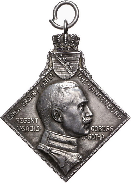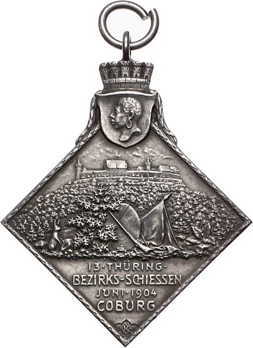 Los-Nummer: Auktion 51 - 1672 Altdeutsche Münzen und Medaillen Sachsen-Coburg-Gotha Ernst Erbprinz zu Hohenlohe-Langenburg, Vormund 1900-1905, Klippe 1904, von Kawaczinsky. Auf das 13. Thüringische Bezirksschießen in Coburg. Büste nach rechts / Ansicht der Veste Coburg, davor Hase und Schützenutensilien, im Abschnitt vier Zeilen Schrift. Peltzer 970, Slg. Kozinowski 1859. 37 x 37 mm, 45,33 g. Vorzüglich Schätzpreis: 150,- Zuschlag: unverkauft |