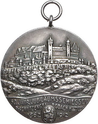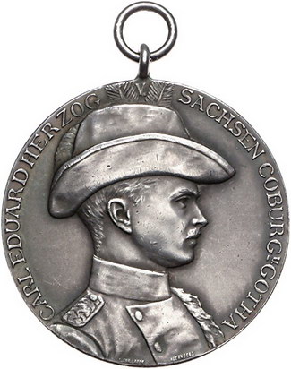 Los-Nummer: Auktion 51 - 1674 Altdeutsche Münzen und Medaillen Sachsen-Coburg-Gotha Carl Eduard 1905-1918, Medaille 1912, von Lauer. Auf das 50jährige Jubiläumsschießen der Schützengesellschaft Rodach. Brustbild mit Jägerhut nach rechts / Bewaldete Landschaft mit der Veste Coburg, unten zwei Zeilen Schrift. Slg. Kozinowski -. 33 mm, 15 g. Trageöse, vorzüglich Schätzpreis: 125,- Zuschlag: unverkauft |