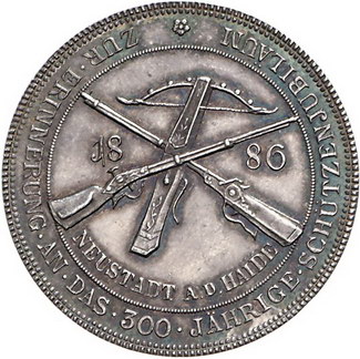 Los-Nummer: Auktion 51 - 1683 Altdeutsche Münzen und Medaillen Sachsen-Coburg, Stadt Medaille 1886, von Lauer. Auf das 300jährige Jubiläum der Schützengesellschaft in Neustadt a.d. Heide. Brustbild Johann Casimirs von vorn / Jahreszahl zwischen gekreuzten Gewehren und Armbrust. Randpunze Beschauzeichen und 0,990. Slg. Merseburger 3362 (Nickel) , Slg. Kozinowski -. 33 mm, 15,5 g. Kl. Randfehler, vorzüglich + Schätzpreis: 75,- Zuschlag: 160,- |