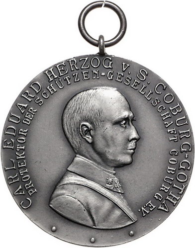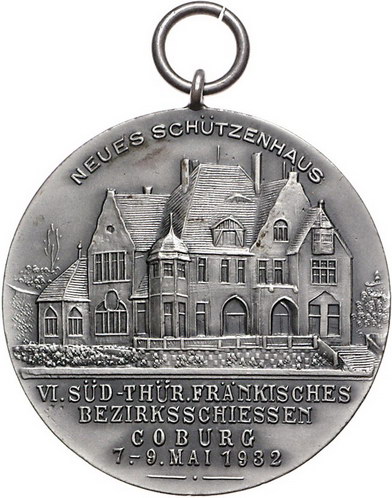 Los-Nummer: Auktion 51 - 1684 Altdeutsche Münzen und Medaillen Sachsen-Coburg, Stadt Medaille 1932. Auf das 6. Südthüringisch-fränkische Bezirksschießen in Coburg. Brustbild des Protektors Carl Eduard nach rechts / Ansicht des neuen Schützenhauses. Slg. Kozinowski 1888. Randpunze 990. 40 mm, 25,4 g. Trageöse. Mattiert, vorzüglich Schätzpreis: 100,- Zuschlag: 80,- |