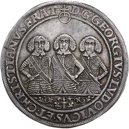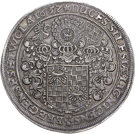 Los-Nummer: Auktion 51 - 1743 Altdeutsche Münzen und Medaillen Schlesien-Liegnitz-Brieg Georg, Ludwig und Christian 1639-1663, Taler 1657, Breslau. Die geharnischten Hüftbilder der drei Herzöge nebeneinander von vorn / Dreifach behelmtes und verziertes Wappen. Fr.u.S. 1758, Davenport 7731. Schöne Patina. Schwache Tuscheziffer, sehr schön - vorzüglich Schätzpreis: 2000,- Zuschlag: 1950,- |