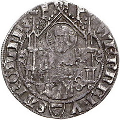 Los-Nummer: Auktion 51 - 1832 Altdeutsche Münzen und Medaillen Trier, Erzbistum Werner von Falkenstein 1388-1418, Weißpfennig, Trier. WERNERV-SARChIEPS Hüftbild St. Petri unter gotischem Schutzdach / MONETA:NOVA:TREVERENS Trierer Schild in rundem Achtpass. Noss 371 a. Äußerst selten. Leichte Korrosionsspuren, fast sehr schön Schätzpreis: 750,- Zuschlag: unverkauft |