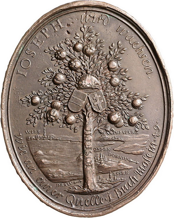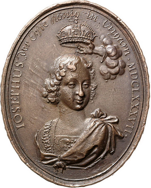 Los-Nummer: Auktion 51 - 2134 Haus Habsburg Haus Habsburg Josef I. 1705-1711, Ovale Bronzegussmedaille 1687. Auf seine Krönung zum König von Ungarn. Hand aus Wolken hält Krone über das jugendliche Brustbild Josefs / Granatapfelbaum, im Hintergrund die Donau mit den Städten Wien, Pressburg, Ofen und Essek. Mit Randschrift. Slg. Montenuovo zu 1184. 76 x 61 mm. Neuerer Guss. Sehr schön - vorzüglich Schätzpreis: 175,- Zuschlag: 160,- |