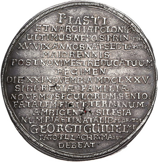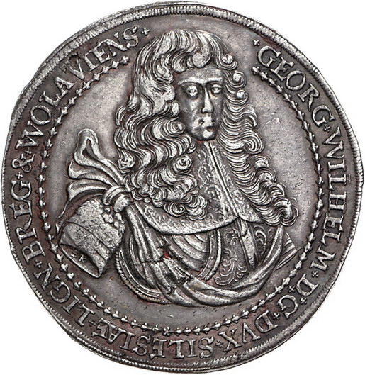 Los-Nummer: Auktion 51 - 1744 Altdeutsche Münzen und Medaillen Schlesien-Liegnitz-Brieg Georg Wilhelm 1672-1675, 1 1/4 Taler 1675. Auf seinen Tod. Brustbild mit umgelegtem Mantel halbrechts / Sechzehn Zeilen Schrift. Fr.u.S. zu 1973, Davenport 488. 33,73 g. Schrötlingsfehler, sehr schön Schätzpreis: 1250,- Zuschlag: 1650,- |
