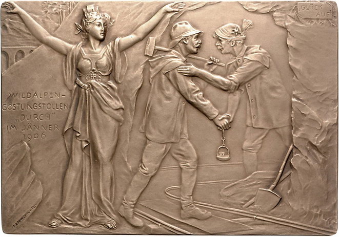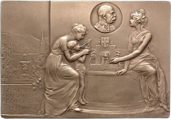Los-Nummer: Auktion 51 - 2276 Medaillen Ausbeute Österreich Bronzeplakette#0Medaille# 1906, von Pawlik. Auf den Durchbruch der zweiten Franz Josef-Hochquellen-Leitung. An Brunnen mit Franz Josef-Porträtmedaillon sitzen Vindobona und weibliche Person mit Kind, im linken Abschnitt Stadtansicht Wiens / Zwei Bergleute in Stollenmundloch begrüßen sich, links weibliche Person mit Mauerkrone. Müseler 45/35. 84,5 x 59,5 mm. Mattiert. Vorzüglich Schätzpreis: 75,- Zuschlag: 80,- |