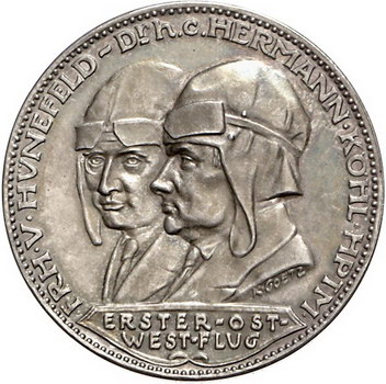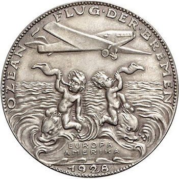 Los-Nummer: Auktion 51 - 2326 Medaillen Luftfahrt Medaille 1928, von Karl Goetz. Auf den Ost-West-Ozeanflug der 'Bremen'. Die Brustbilder von Hühnefelds und Köhls / Flugzeug über dem Meer, darunter zwei Putten auf Delfinen reitend. Kaiser 928.5 , Kienast 393. 36 mm, 19,80 g. Mattiert. Vorzüglich - Stempelglanz Schätzpreis: 75,- Zuschlag: 120,- |