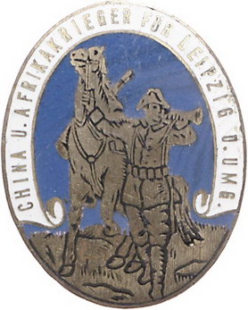 Los-Nummer: Auktion 51 - 2489 Medaillen Kolonien Farbig emailliertes ovales Abzeichen#0Medaille# Für China- und Afrikakrieger für Leipzig und Umgebung. Schutztruppensoldat mit Pferd. Ca. 35 x 28 mm. Tragevorrichtung beschädigt, ohne Nadel. Sehr schön Schätzpreis: 150,- Zuschlag: unverkauft |