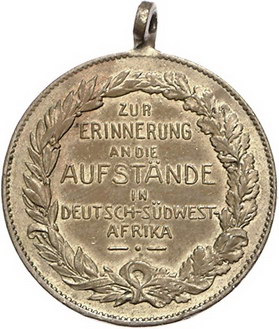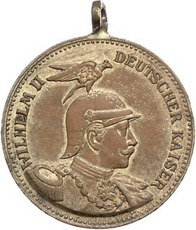 Los-Nummer: Auktion 51 - 2487 Medaillen Kolonien Bronzemedaille o.J. Zur Erinnerung an die Aufstände in Deutsch-Südwest-Afrika. Brustbild Wilhelms II. in Uniform nach rechts / Schrift in Kranz. Slg. Grönegreß 1273. 28,5 mm. Originalöse. Sehr schön - vorzüglich Schätzpreis: 100,- Zuschlag: 80,- |