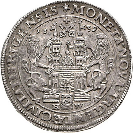 Los-Nummer: Auktion 51 - 2836 Ausländische Münzen und Medaillen Baltikum-Riga, Stadt Christina von Schweden 1632-1654, Taler 1639. Münzmeistersignatur H - W (Heinrich Wulff). Geharnischtes Hüftbild nach links neben Tisch mit Krönungsinsignien / Von zwei Löwen gehaltenes Stadtwappen. S.B. 44 b, Neumann 33, Davenport 4589. Sehr schön - vorzüglich Schätzpreis: 7500,- Zuschlag: 6000,- |