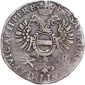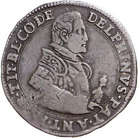 Los-Nummer: Auktion 51 - 3178 Ausländische Münzen und Medaillen Italien-Desana Antonio Maria Tizzone 1598-1641, Billon Testone o.J. Hüftbild mit Kommandostab nach rechts / Gekrönter Doppeladler mit Bindenschild auf der Brust. Nachahmung österreichischer 15 Kreuzer. Varesi 561, CNI 34 ff. Schön - sehr schön Schätzpreis: 250,- Zuschlag: 320,- |