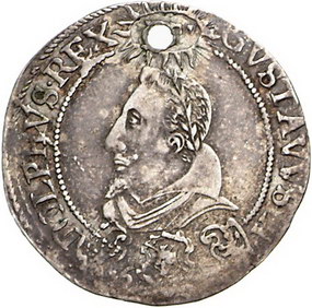 Los-Nummer: Auktion 51 - 3924 Ausländische Münzen und Medaillen Schweden Gustav II. Adolf 1611-1632, 1/8 Taler 1617. Auf seine Krönung. Brustbild nach links / Strahlende Sonne über Rosenstock, der durch Krone wächst. S.M. 85. Sehr selten. Gelocht, sehr schön Schätzpreis: 250,- Zuschlag: unverkauft |