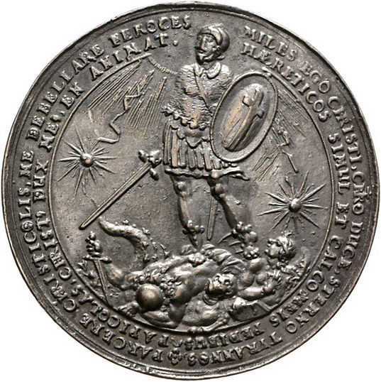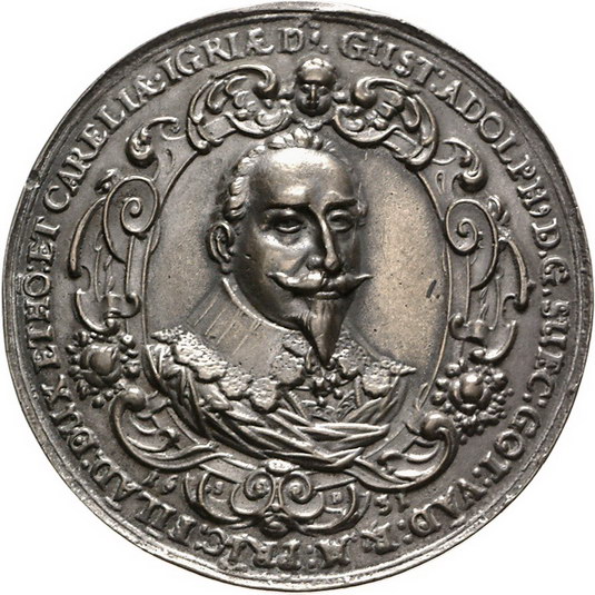Los-Nummer: Auktion 51 - 3927 Ausländische Münzen und Medaillen Schweden Gustav II. Adolf 1611-1632, Versilberte Bronzegussmedaille 1631, von Dadler. Auf seine Siege. Brustbild fast von vorn in ovaler Kartusche / Gustav Adolf als Erzengel Michael mit Schwert und Schild über am Boden liegenden Feinden. Hildebrand zu 57 , Wiecek zu 74. 55 mm. Neuerer Guss. Vorzüglich Schätzpreis: 75,- Zuschlag: 105,- |