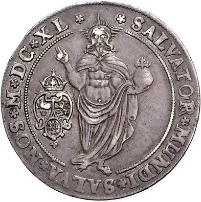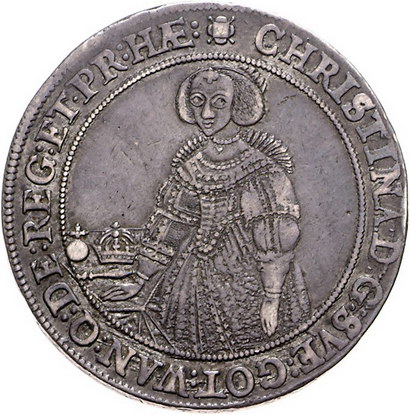 Los-Nummer: Auktion 51 - 3934 Ausländische Münzen und Medaillen Schweden Christina 1632-1654, Taler 1640, Stockholm. Hüftbild halblinks neben Tisch mit Krönungsinsignien / Stehender Christus als Salvator Mundi. S.M. 11, Davenport 4523. Sehr schön - vorzüglich Schätzpreis: 1000,- Zuschlag: 1400,- |