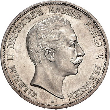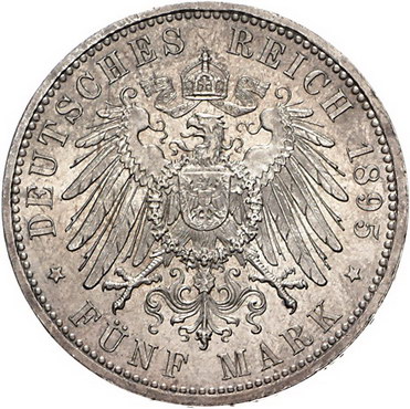 Los-Nummer: Auktion 51 - 2655 Münzen des Deutschen Kaiserreichs Preußen Wilhelm II. 1888-1918, 5 Mark 1895 A. Jaeger 104. Vorzüglich - Stempelglanz Schätzpreis: 200,- Zuschlag: 280,- |