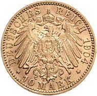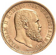 Los-Nummer: Auktion 51 - 2736 Münzen des Deutschen Kaiserreichs Württemberg Wilhelm II. 1891-1918, 10 Mark 1904 F. Jaeger 295. GOLD. Vorzüglich Schätzpreis: 175,- Zuschlag: unverkauft |