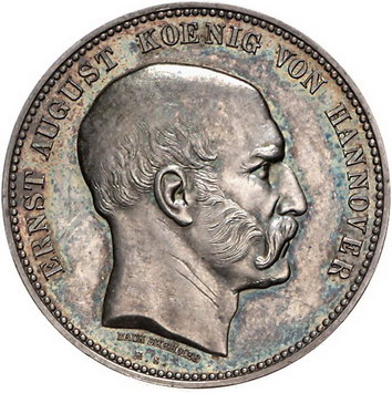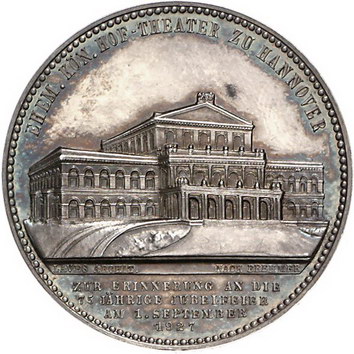 Los-Nummer: Auktion 51 - 674 Altdeutsche Münzen und Medaillen Braunschweig-Calenberg-Hannover Ernst August 1837-1851, Medaille 1927, nach Friedrich Brehmer. Auf die 75-Jahrfeier des königlichen Hoftheaters. Kopf nach rechts / Das Theatergebäude. Brockmann 1086. 36 mm. Schöne Patina. Vorzüglich - Stempelglanz Schätzpreis: 100,- Zuschlag: unverkauft |