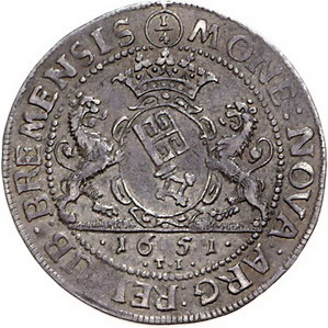 Los-Nummer: Auktion 51 - 698 Altdeutsche Münzen und Medaillen Bremen, Stadt 1/4 Taler 1651. Jungk 541. Üblicher Stempelfehler, sehr schön + Schätzpreis: 200,- Zuschlag: 185,- |