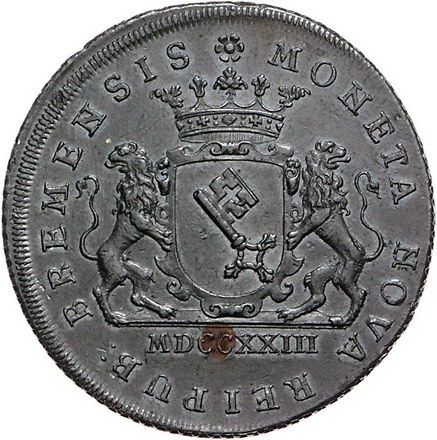 Los-Nummer: Auktion 51 - 702 Altdeutsche Münzen und Medaillen Bremen, Stadt Probe-Zinnabschlag von den Stempeln des Talers 1723. Jungk zu 507, Davenport zu 2045 , Sammlung Danziger 445 (dieses Exemplar). Mit Original Kupferstift und Rändelung. Von größter Seltenheit. Vorzüglich Schätzpreis: 1250,- Zuschlag: unverkauft |
