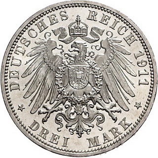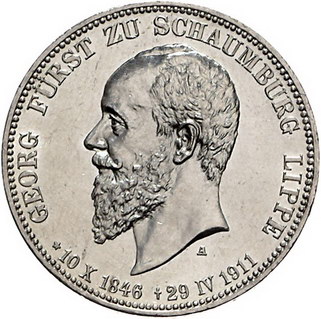 Los-Nummer: Auktion 51 - 2719 Münzen des Deutschen Kaiserreichs Schaumburg-Lippe Georg 1893-1911, 3 Mark 1911 A. Auf seinen Tod. Jaeger 166. Vorzüglich - Stempelglanz Schätzpreis: 100,- Zuschlag: unverkauft |