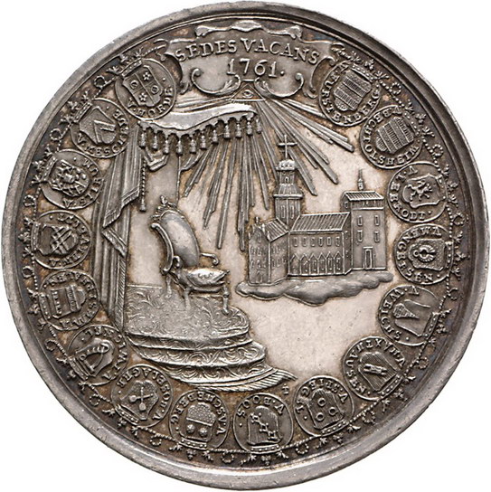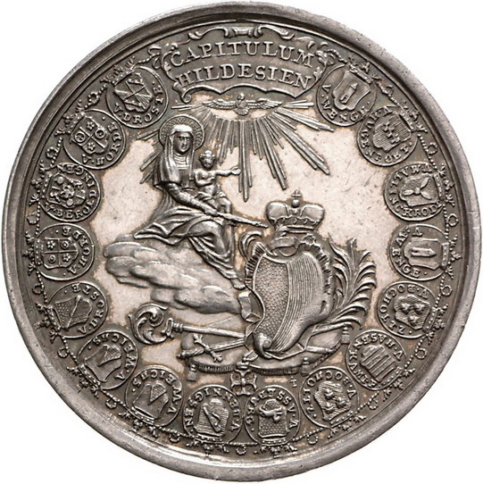 Los-Nummer: Auktion 51 - 930 Altdeutsche Münzen und Medaillen Hildesheim, Bistum Sedisvakanz 1761-1763, Medaille 1761, von Thiébaud. Im Wappenkranz auf einer Wolke sitzende Maria mit dem Kind weist auf Stiftswappen / Unter einem Baldachin ein leerer Thronsessel, daneben Kirche, umgeben von Wappenkranz. Mehl 676, Zepernick 145 , Cappe 311. 56 mm, 44,05 g. Fast vorzüglich Schätzpreis: 150,- Zuschlag: 250,- |