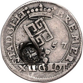 Los-Nummer: Auktion 51 - 1096 Altdeutsche Münzen und Medaillen Mecklenburg-Wismar, Stadt Gegenstempel Stadtschild (1715) auf Bremen. 12 Grote 1657. Kunzel Seite 128 , Jungk zu 636. Sehr schön Schätzpreis: 750,- Zuschlag: 800,- |
