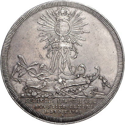 Los-Nummer: Auktion 51 - 1312 Altdeutsche Münzen und Medaillen Oldenburg Friedrich V. von Dänemark 1746-1766, Schautaler#0Medaille# 1749, von Arbien. Auf das 300jährige Bestehen des Hauses Oldenburg. Herausgegeben von der Asiatischen Compagnie. Belorbeertes Brustbild nach rechts / Monogramm über Füllhorn, Merkurstab und Pfeilbündel, oben das strahlende, gekrönte oldenburgische Wappen. Galster 437. 42 mm, 29,40 g. Sehr schön - vorzüglich Schätzpreis: 900,- Zuschlag: 875,- |