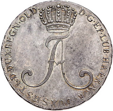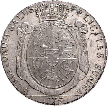 Los-Nummer: Auktion 51 - 1314 Altdeutsche Münzen und Medaillen Oldenburg Friedrich August von Schleswig-Holstein-Gottorp 1773-1785, Taler 1775 B, Altona. Münzmeister Caspar Heinrich Lyng. Stempelschneider Johann Ephraim Bauert. Gekröntes Monogramm / Gekröntes ovales Wappen auf Fürstenmantel. Kalvelage/Trippler 371, Merzdorf 250, Lange 523, Davenport 2411, Jaeger 22, Behrens 838. Feine Patina. Vorzüglich - Stempelglanz Schätzpreis: 2000,- Zuschlag: 2350,- |