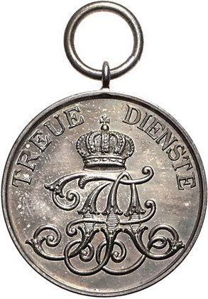 Los-Nummer: Auktion 51 - 1327 Altdeutsche Münzen und Medaillen Oldenburg Friedrich August 1900-1918, Tragbare Verdienstmedaille (Weißmetall) o.J. (1913-18), von Knauer. Verliehen für neun Jahre treue Dienste. Monogramm / IX. Klie 13.1, OEK 1573, Beyreiss 32.3. 30 mm. Fast Stempelglanz Schätzpreis: 200,- Zuschlag: 210,- |
