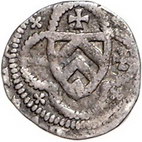 Los-Nummer: Auktion 51 - 1450 Altdeutsche Münzen und Medaillen Ravensberg, Grafschaft Bernhard 1329-1346, Pfennig. 1,17 g. \\\\\\\RFEPI Sitzender Graf mit sieben Locken, Lilienzepter und Reichsapfel / \\\\\\\BVEL Sparrenschild in Vierpass, in dessen Ausbuchtungen oben und an den Seiten Kreuze, in den Winkeln Schrägkreuze. Stange 35. Sehr schön Schätzpreis: 500,- Zuschlag: 400,- |