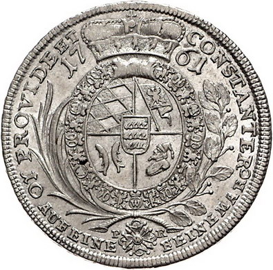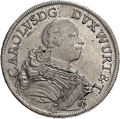 Los-Nummer: Auktion 51 - 1890 Altdeutsche Münzen und Medaillen Württemberg Karl Eugen 1744-1793, Taler 1761. Geharnischtes Brustbild mit im Nacken zusammengebundenen Haaren nach rechts / Unter Fürstenhut das vierfeldige Wappen mit aufgelegtem Mittelschild und mit Ordenskette zwischen Palm- und Lorbeerzweig. Klein/Raff 362, Davenport 2862. Vorzüglich + / vorzüglich - Stempelglanz Schätzpreis: 750,- Zuschlag: 750,- |