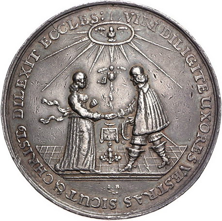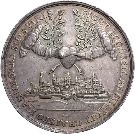 Los-Nummer: Auktion 51 - 1737 Altdeutsche Münzen und Medaillen Schlesien-Breslau, Stadt Medaillen von Johann Buchheim *1642 Breslau, +1683, Medaille o.J. Auf die Hochzeit. Junges Paar reicht sich die Hand / Zwei Hände mit Herz über Stadtansicht von Breslau. Fr.u.S. 5031, Slg. Strieboll 2223 , Slg. Goppel -. 47 mm, 26,40 g. Sehr schön - vorzüglich Schätzpreis: 125,- Zuschlag: 180,- |