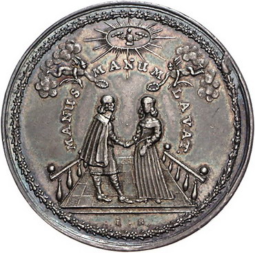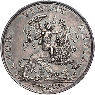 Los-Nummer: Auktion 51 - 1738 Altdeutsche Münzen und Medaillen Schlesien-Breslau, Stadt Medaillen von Johann Buchheim *1642 Breslau, +1683, Medaille o.J. Auf die Hochzeit. Junges Paar reicht sich auf einer Brücke die Hand / Amor auf einem Löwen. Fr.u.S. -, Slg. Strieboll - , Slg. Goppel -. 38 mm, 14,00 g. Schöne Patina. Vorzüglich Schätzpreis: 125,- Zuschlag: 460,- |