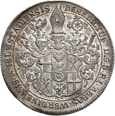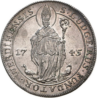 Los-Nummer: Auktion 51 - 1863 Altdeutsche Münzen und Medaillen Werden und Helmstedt Benedikt von Geismar 1728-1757, Taler 1745. St. Ludgerus steht mit Krummstab zwischen geteilter Jahreszahl, unten zu beiden Seiten eine Gans / Dreifach behelmtes, siebenfeldiges Wappen mit aufgelegtem Mittelschild. Grote 57, Davenport 2843. Äußerst selten. Kl. Stempelfehler, vorzüglich Schätzpreis: 9000,- Zuschlag: unverkauft |