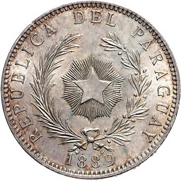 Los-Nummer: Auktion 51 - 3592 Ausländische Münzen und Medaillen Paraguay Peso 1889, Birmingham. K.M. 5. Prachtexemplar. Fast Stempelglanz Schätzpreis: 500,- Zuschlag: 400,- |