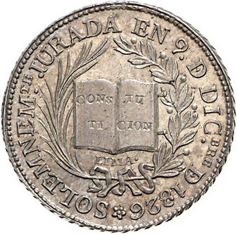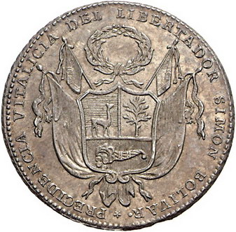 Los-Nummer: Auktion 51 - 3593 Ausländische Münzen und Medaillen Peru Republik seit 1821, 6 Reales 1826. Auf die lebenslange Präsidentschaft Bolivars und den Schwur auf die Verfassung. Wappen vor vier Fahnen, darüber Kranz / Buch zwischen Palm- und Lorbeerzweig. Slg. Fonrobert 9018. 34,5 mm, 17,90 g. Fast Stempelglanz Schätzpreis: 300,- Zuschlag: 240,- |