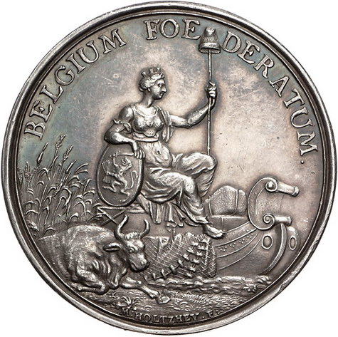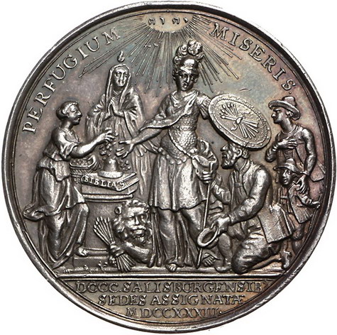 Los-Nummer: Auktion 51 - 2242 Haus Habsburg Salzburg, Erzbistum Leopold Anton Eleutherius von Firmian 1727-1744, Medaille 1733, von Holtzhey. Auf die Auswanderung der Salzburger Emigranten in die Niederlande. Belgia mit Glaube und Barmherzigkeit eine Emigrantenfamilie beschützend / Belgia mit Freiheitshut am Meeresufer sitzend, vor ihr liegender Ochse, hinter ihr Schiff. Roll 33. 49 mm, 46,60 g Schöne Patina. Winz. Randfehler, vorzüglich Schätzpreis: 750,- Zuschlag: unverkauft |