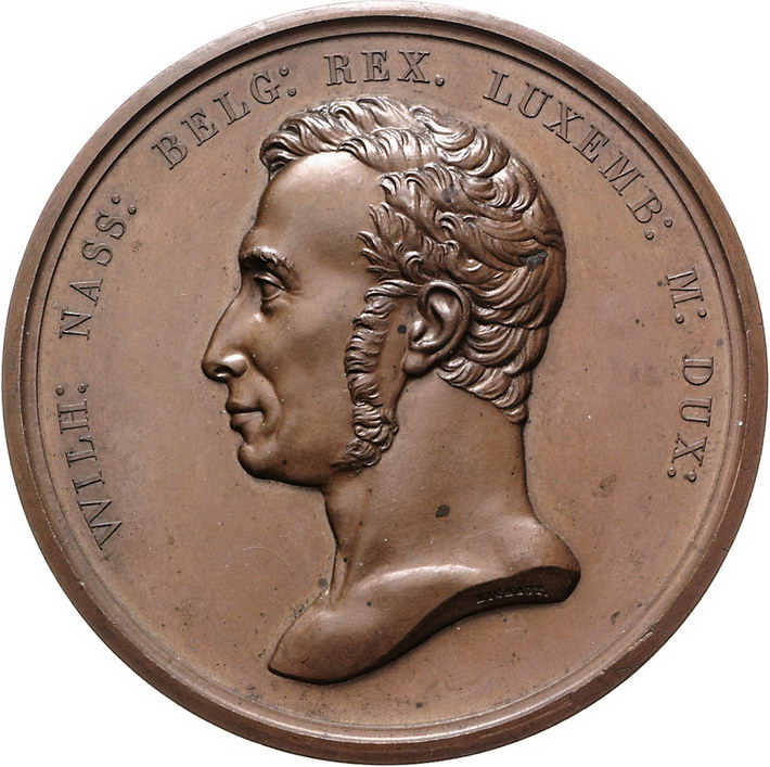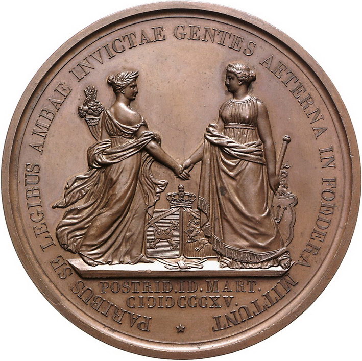 Los-Nummer: Auktion 51 - 3459 Ausländische Münzen und Medaillen Niederlande-Königreich Wilhelm I. 1815-1840, Bronzemedaille 1815, von Michaut. Auf die Proklamation zum König und die Wiedervereinigung von Holland und Belgien. Büste nach links / Personifikationen von Flandern und den Niederlanden reichen sich die Hand. Dirks 38, PiN. 990. 72 mm. Fast Stempelglanz Schätzpreis: 175,- Zuschlag: unverkauft |