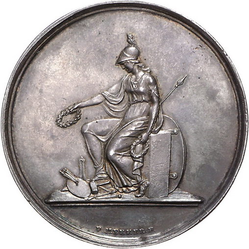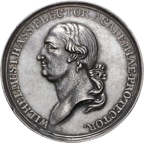 Los-Nummer: Auktion 51 - 918 Altdeutsche Münzen und Medaillen Hessen-Kassel Wilhelm I. 1803-1821, Medaille o.J., von Merker. Prämie der Kunstakademie. Büste mit im Nacken zusammen gebundenen Haaren nach links / Sitzende Minerva, umgeben von Gegenständen der Malerei. Hoffmeister 2853, Schütz 2280 , Slg. Fiorino 1492. 52 mm, 57,15 g. Schöne Patina. Winz. Randfehler, vorzüglich + Schätzpreis: 1000,- Zuschlag: 950,- |