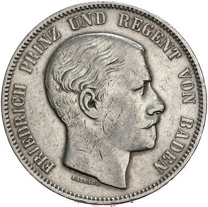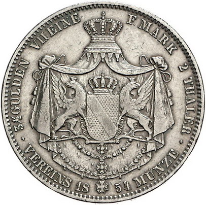 Los-Nummer: Auktion 51 - 86 Altdeutsche Münzen und Medaillen Baden-Durlach Friedrich I. 1852-1907, Doppeltaler 1854. Prinz und Regent. Jaeger 71 a, Thun 28, AKS 114, Kahnt 34. Sehr schön Schätzpreis: 500,- Zuschlag: 490,- |