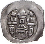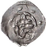 Los-Nummer: Auktion 51 - 1355 Altdeutsche Münzen und Medaillen Passau, Bistum Bertold von Peiting 1250-1254 bis Otto von Lonsdorf 1254-1265, Pfennig (1250/55). 0,92 g. Zwischen Zinnentürmen mitrierter Kopf unter Spitzturm / Geflügeltes Ungeheuer. Kellner 32(23). Schöne Patina. Fast vorzüglich Schätzpreis: 100,- Zuschlag: 110,- |