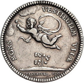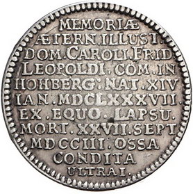 Los-Nummer: Auktion 51 - 1739 Altdeutsche Münzen und Medaillen Schlesien-Hochberg Carl Friedrich Leopold, Medaille 1703, von Dishoecke. Auf seinen Tod durch einen Reitunfall. Putto über Strauch. Fr.u.S. 3791, Slg. Strieboll 2015 (40 Mark). Sehr schön Schätzpreis: 200,- Zuschlag: unverkauft |