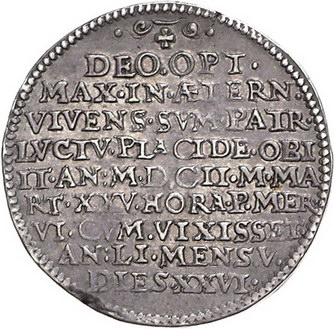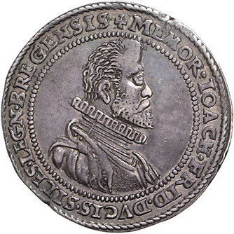 Los-Nummer: Auktion 51 - 1742 Altdeutsche Münzen und Medaillen Schlesien-Liegnitz-Brieg Joachim Friedrich 1586-1602, 1/2 Taler 1602. Auf seinen Tod. Fr.u.S. 1386. Schöne Patina. Winz. Schrötlingsfehler am Rand, sehr schön + Schätzpreis: 1500,- Zuschlag: 1250,- |