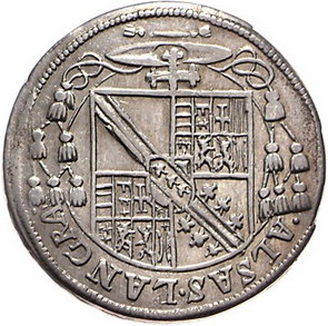 Los-Nummer: Auktion 51 - 3046 Ausländische Münzen und Medaillen Frankreich-Straßburg, bischöfliche Münzstätte Karl von Lothringen 1593-1607, Teston o.J. E.u.L. 254. Fast vorzüglich Schätzpreis: 125,- Zuschlag: 150,- |