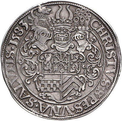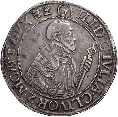 Los-Nummer: Auktion 51 - 954 Altdeutsche Münzen und Medaillen Jülich-Berg Wilhelm V. 1539-1592, Taler 1583, Düsseldorf. Jahreszahl im Stempel aus 68 geändert. Geharnischtes Hüftbild mit Kommandostab links / Dreifach behelmtes fünffeldiges Wappen. Noss 385 b, Davenport 8936. Sehr schön Schätzpreis: 1500,- Zuschlag: 1200,- |