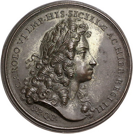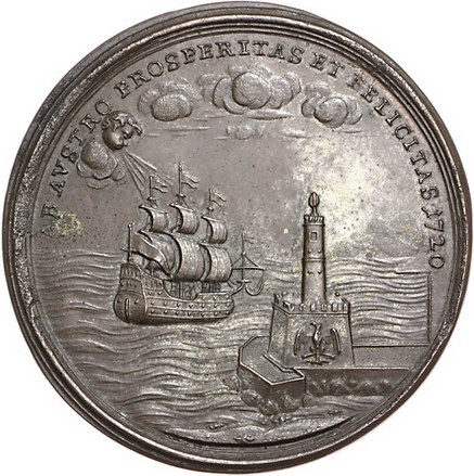 Los-Nummer: Auktion 51 - 2167 Haus Habsburg Haus Habsburg Karl VI. 1711-1740, Bronzemedaille 1720, von Travani. Auf die Wiedererlangung Siziliens, Widmung der Stadt Palermo. Büste nach rechts / Hafenansicht von Palermo mit Leuchtfeuer, dahinter Segelschiff. Slg. Montenuovo 1568 , Slg. Julius 1356. 45,5 mm. Vorzüglich Schätzpreis: 200,- Zuschlag: 460,- |