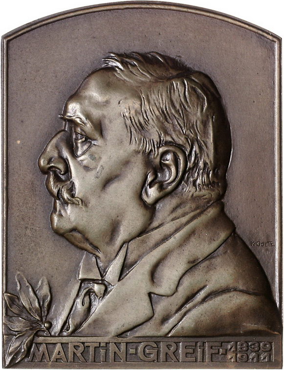 Los-Nummer: Auktion 51 - 2350 Medaillen Münchner Medailleure Goetz, Karl Bronzeplakette#0Medaille# 1909. Auf den Münchener Poeten Martin Greif. Brustbild nach links. Kienast 34. 93,5 x 72 mm. Im Etui. Gussfrisch Schätzpreis: 200,- Zuschlag: 220,- |