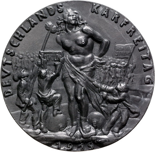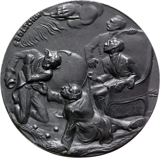 Los-Nummer: Auktion 51 - 2373 Medaillen Münchner Medailleure Goetz, Karl Weißmetallgussmedaille 1919. 'Deutschlands Karfreitag'. Stehende, gefesselte Germania wird von drei Männern ihrer letzten Kleidung beraubt, im Hintergrund Bevölkerung im Generalstreik / Die Sieger des Krieges würfeln um Germanias Lendentuch und betrachten als neue Gefahr den Bolschewismus. Kienast 224. 88 mm. Patiniert. Gussfrisch Schätzpreis: 175,- Zuschlag: unverkauft |
