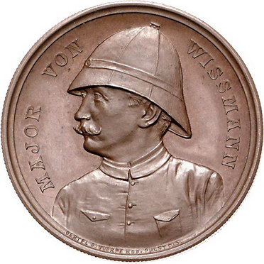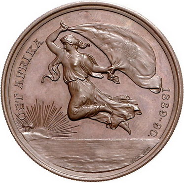 Los-Nummer: Auktion 51 - 2482 Medaillen Kolonien Bronzemedaille 1890, von Oertel. Auf die Übernahme des Schutzgebietes Deutsch Ostafrika in die Reichsverwaltung. Brustbild des Majors von Wissmann mit Tropenhelm nach links / Genius mit Kriegsflagge über Meer. Slg. Grönegreß 1299. 38,5 mm. Vorzüglich - Stempelglanz Schätzpreis: 350,- Zuschlag: unverkauft |