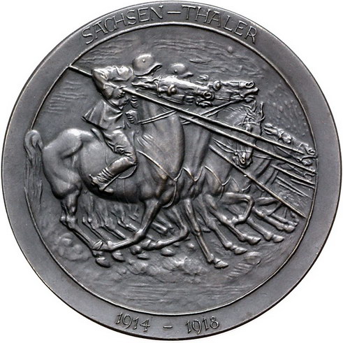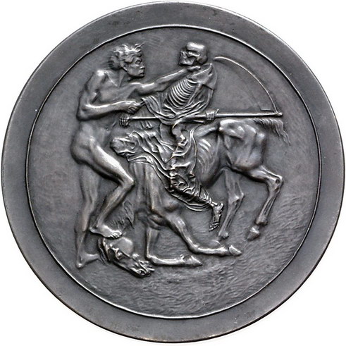 Los-Nummer: Auktion 51 - 2528 Medaillen Erster Weltkrieg Bronzemedaille o.J., unsigniert, möglicherweise von Ott, München. Zur Erinnerung an den Ersten Weltkrieg. Soldaten mit langen Lanzen auf in einer Reihe aufgestellten Pferden / Unbekleideter Mann umarmt den Tod als Skelett mit Sense auf einem mageren Gaul. 60 mm. Vorzüglich Schätzpreis: 125,- Zuschlag: unverkauft |