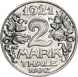 Los-Nummer: Auktion 51 - 2774 Notmünzen deutscher Städte und Gemeinden Thale am Harz Silberabschlag von den Stempeln des 2 Mark 1921. Frenzel A 537.8. Vorzüglich - Stempelglanz Schätzpreis: 250,- Zuschlag: unverkauft |